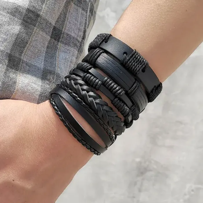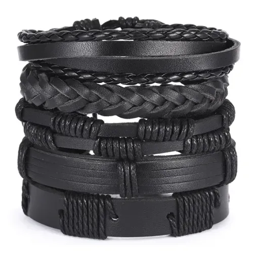 Набор из пяти регулируемых браслетов из кожи черного цвета.