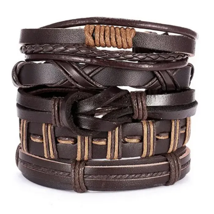 Набор из пяти браслетов для ношения, выполненных из натуральной кожи коричневого цвета. Браслеты регулируются по длине.