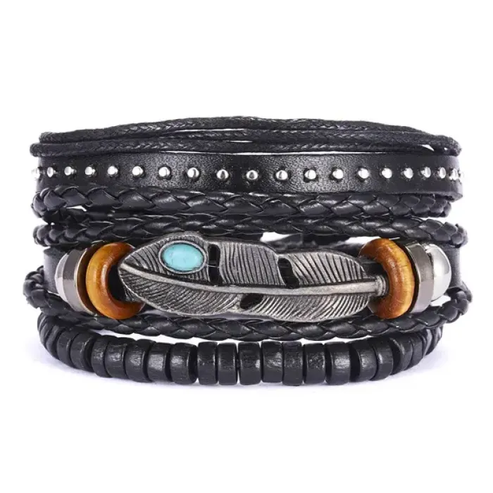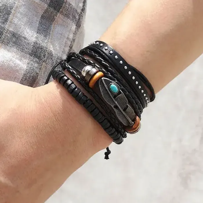 Набор из трёх регулируемых браслетов для запястья. Материалы: кожа, металл, дерево, камень.