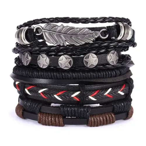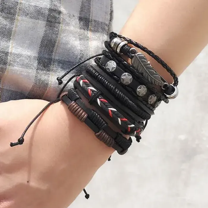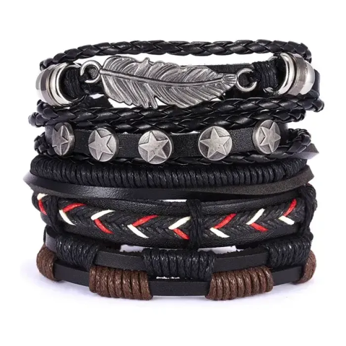 Набор из шести кожаных браслетов черного цвета с металлической фурнитурой. Браслеты имеют регулируемую длину и различаются по дизайну.