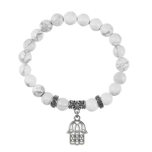 Браслет-амулет из натурального камня кахолонг с подвеской в виде символа Хамса.