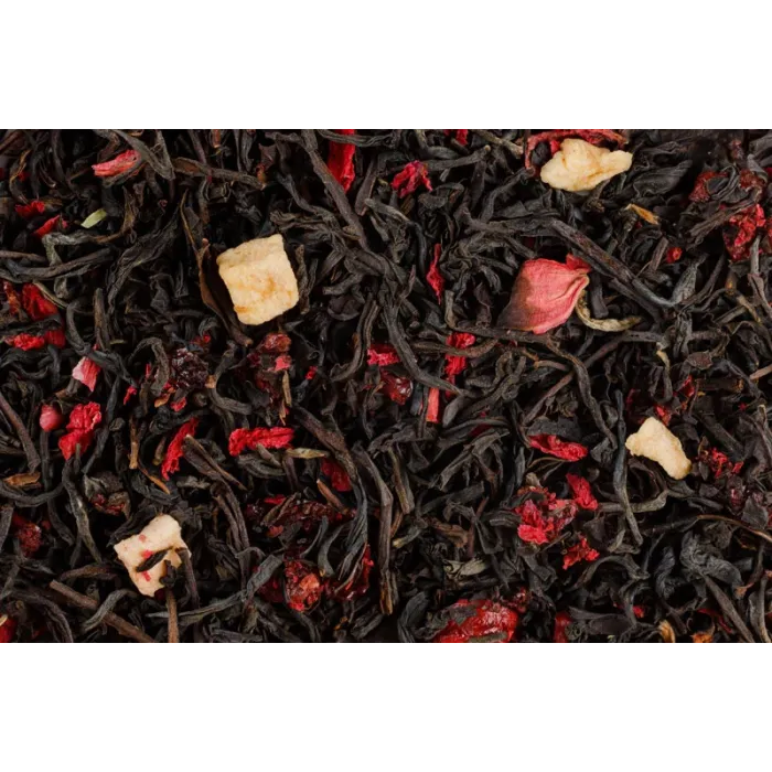 Состав: Чай черный рассыпной листовой крупный, кусочки вишни, яблоко, цветки граната, ароматизатор (идентичный натуральному)