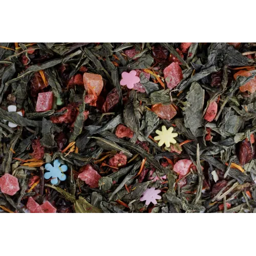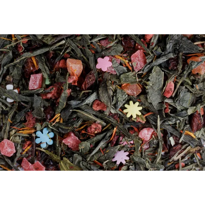Этот яркий фруктово-ягодный купаж создан на основе крупнолистового китайского зелёного чая. Его характер определяют сладкие ноты ананаса и клубники, дополненные лёгкой кислинкой барбариса, а внешнюю праздничность придают кондитерская посыпка и лепестки сафлора.