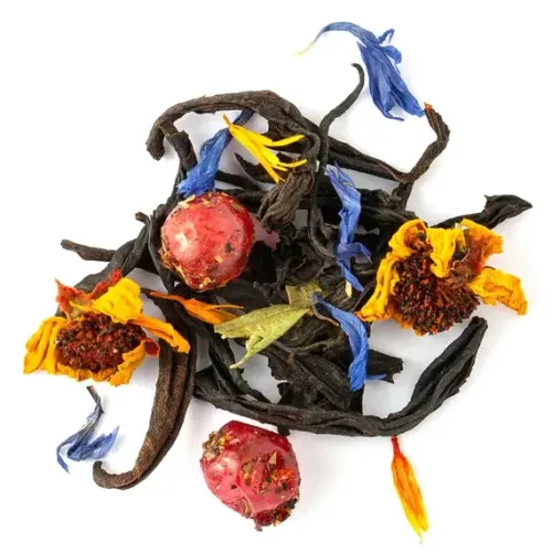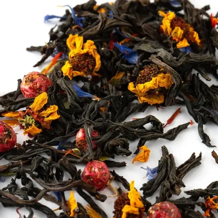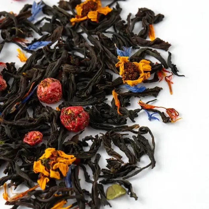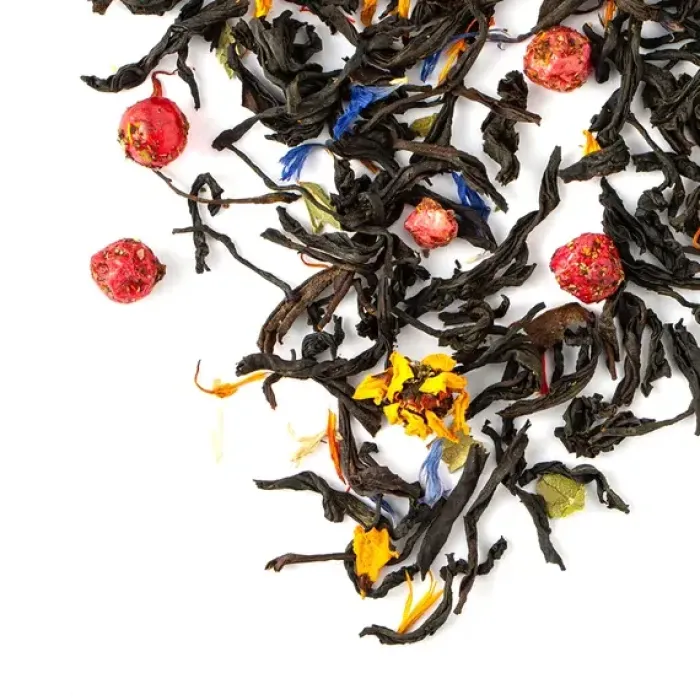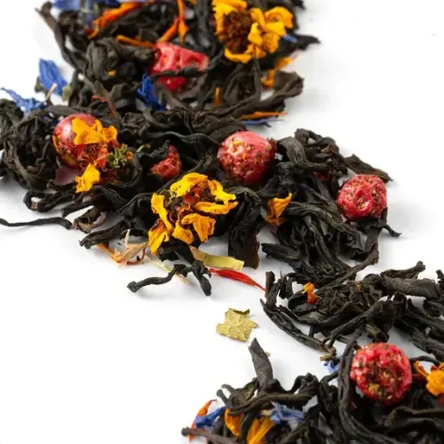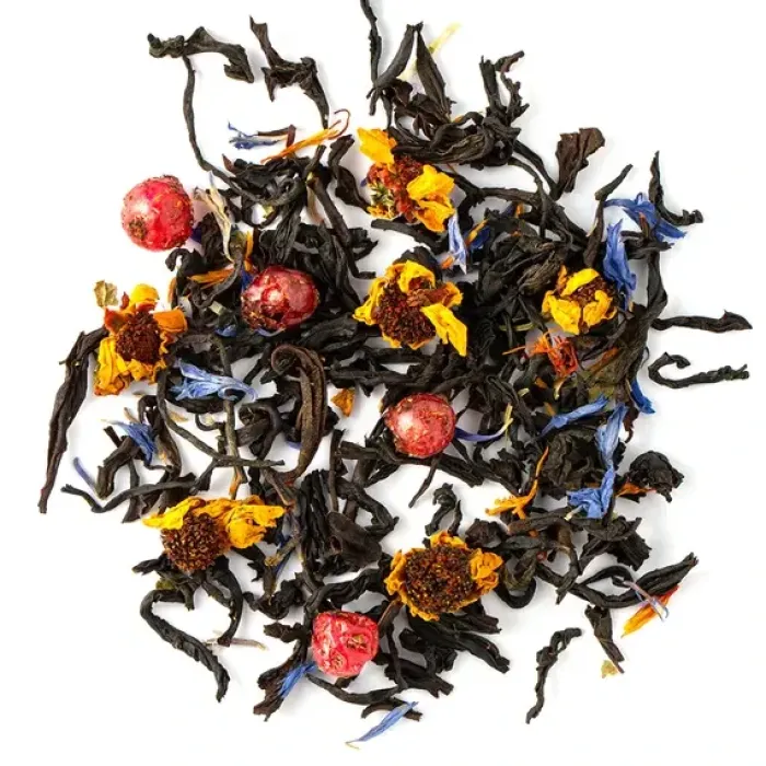 Состав: Чай чёрный индийский, красная смородина, лист смородины, хризантема, лепестки сафлора, лепестки василька, аромат садовых ягод