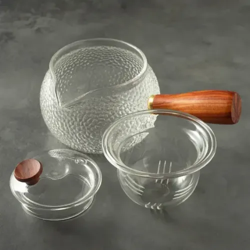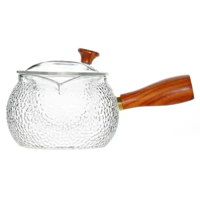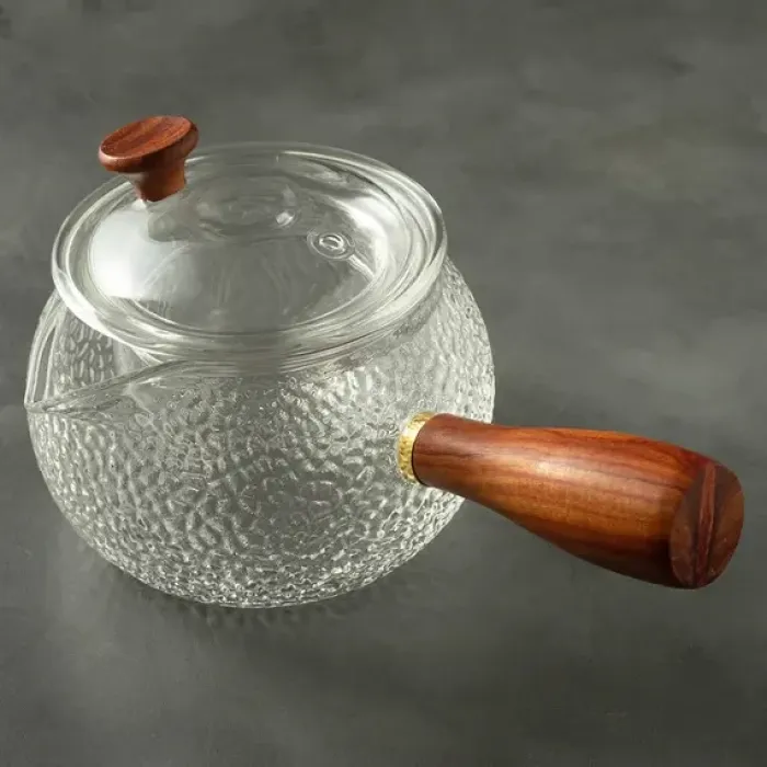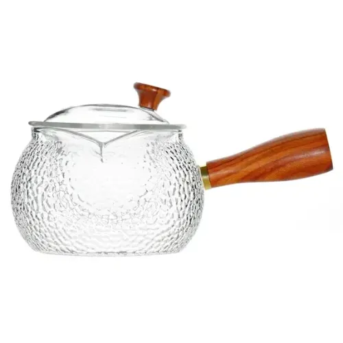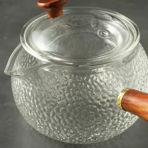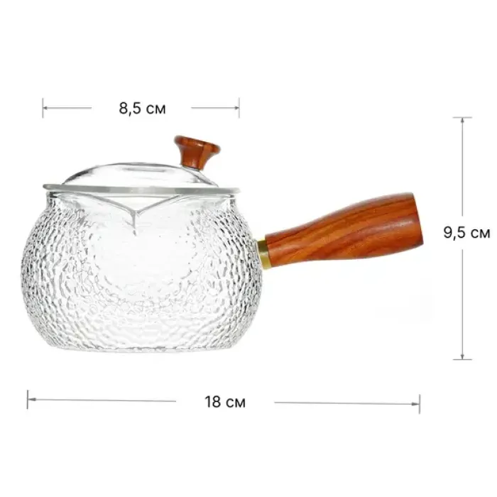 Стеклянный заварочный чайник предназначен для приготовления чая. Его конструкция включает встроенную колбу-сито для фильтрации чайных листьев и деревянную ручку.