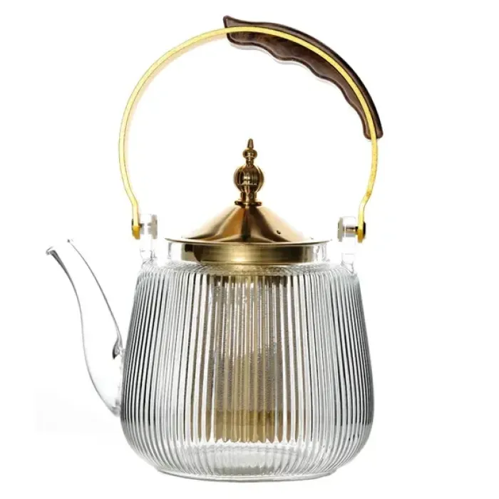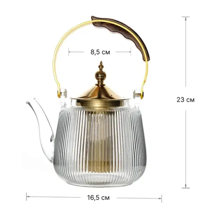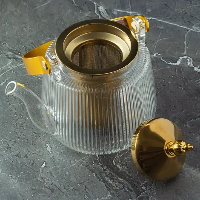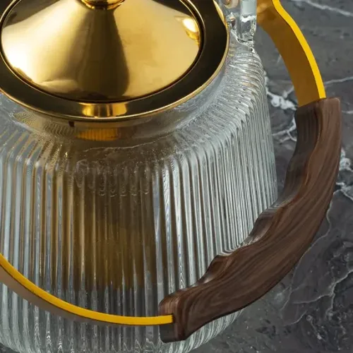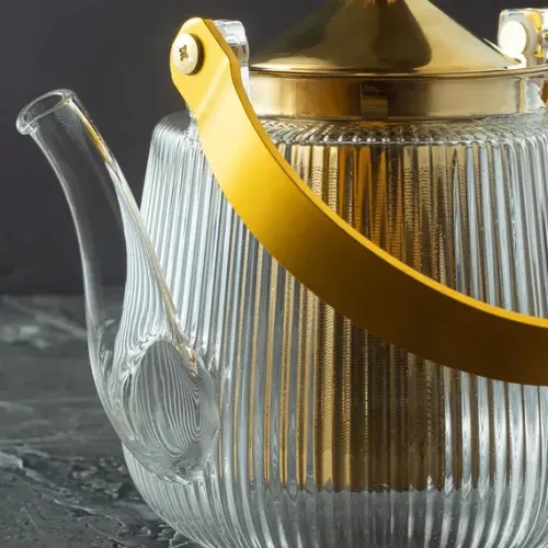 Чайник изготовлен из стекла и металла. Рифлёный корпус придаёт конструкции дополнительную прочность и эстетический вид. Крышка золотистого оттенка и дугообразная ручка обеспечивают удобство использования.
