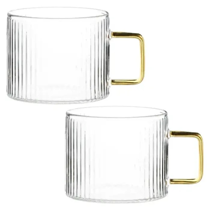 Кружки изготовлены из стекла, что обеспечивает гигиеничность и устойчивость к окрашиванию. Рифлёная текстура поверхности повышает тактильные ощущения и декоративность. Золотистая ручка выполнена как акцентный элемент дизайна.