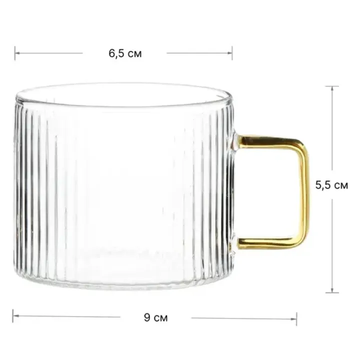 - Материал: стекло- Объём: 130 мл- Количество в наборе: 2 штуки- Особенности: рифлёная текстура, золотистая ручка