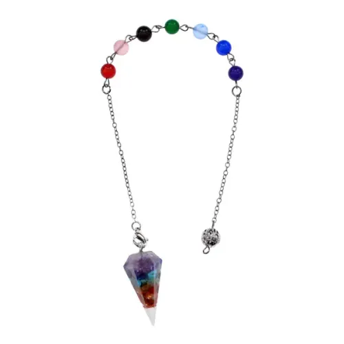 Маятник для практик медитации из бижутерного сплава с камнями, символизирующими чакры.