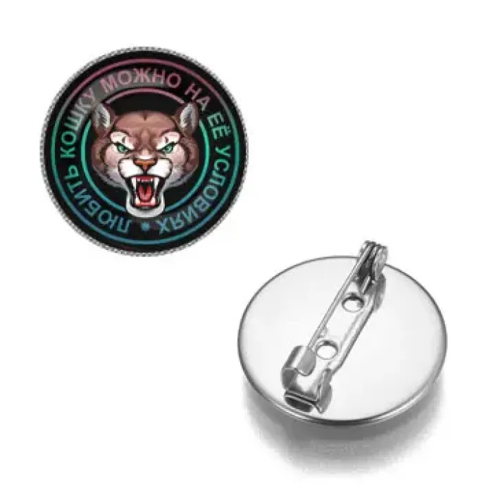 Значок с изображением кошки, выполненный из бижутерного сплава со стеклянной линзой.