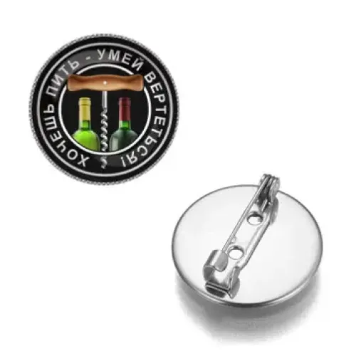 Значок из бижутерного сплава с покрытием под серебро и выпуклой стеклянной линзой.