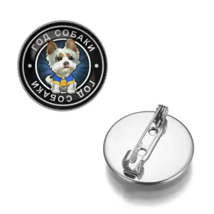 Значок Восточный гороскоп - год Собаки является символом верности и преданности, что делает его идеальным подарком для близких. Изготовлен из бижутерного сплава с покрытием под серебро и стекла, он сочетает в себе элегантность и прочность. Диаметр значка составляет 26 мм, а изображение защищено выпуклой стеклянной линзой, что придаёт ему особую выразительность. Упакован в прозрачный пакет, он готов стать замечательным сувениром или аксессуаром для любого случая.