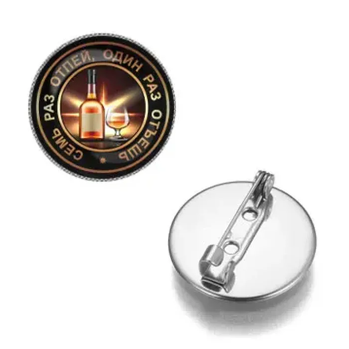 Значок с пословицей, изготовленный из бижутерного сплава со стеклянной линзой.