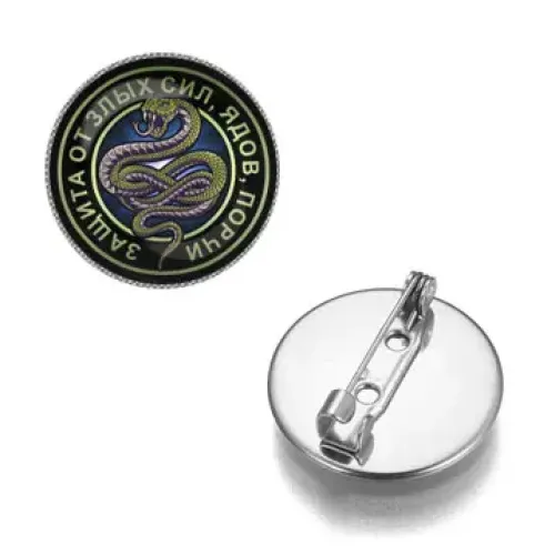 Значок из бижутерного сплава с изображением змеи под выпуклой стеклянной линзой.