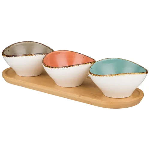 Набор салатников на деревянной подставке Nature от бренда Bronco предназначен для подачи салатов, закусок и десертов. Комплект состоит из трёх салатников из упрочнённого фарфора и одной деревянной подставки для их хранения и сервировки.