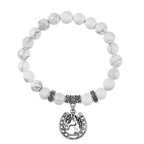 Браслет-амулет из натурального камня кахолонг с подвеской-талисманом в виде подковы из бижутерного сплава.