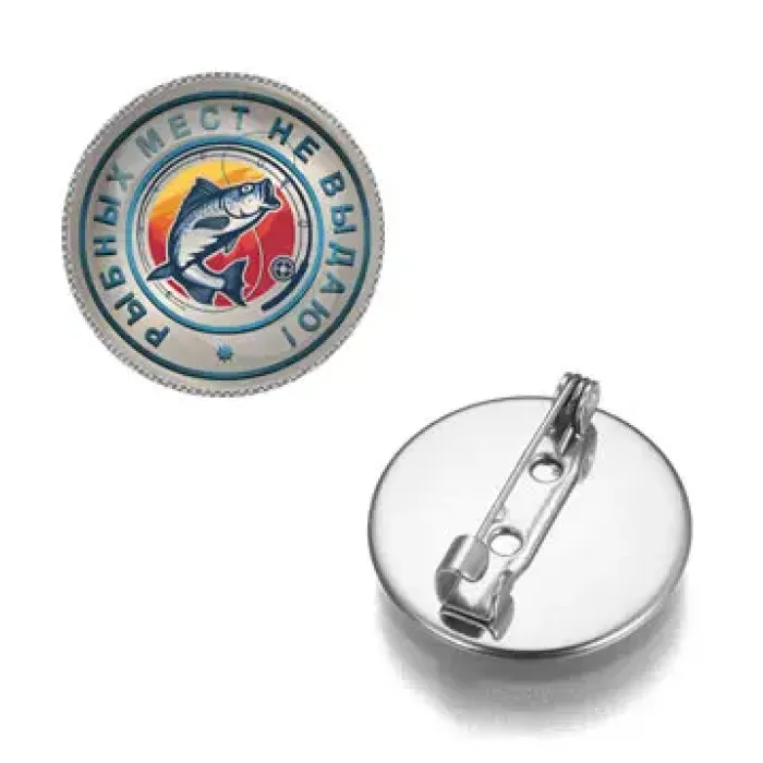 Сувенирный значок «Рыбных мест не выдаю» из бижутерного сплава с выпуклой стеклянной линзой.