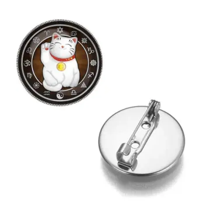 Значок с изображением Манеки-Неко, символ удачи. Изготовлен из бижутерного сплава со стеклянной линзой.