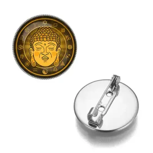 Значок с изображением Будды из бижутерного сплава с покрытием под серебро и стеклянной линзой.