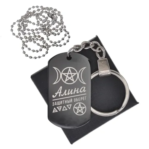 Именной амулет из нержавеющей стали с полированной и черненой поверхностью. На жетон нанесена гравировка изображения.