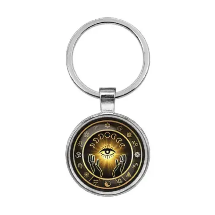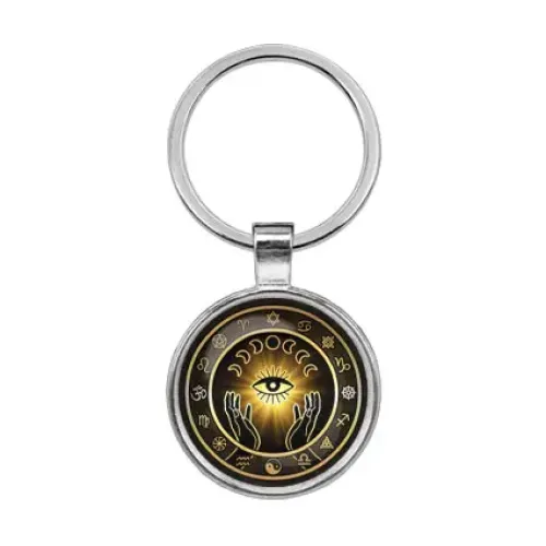 Брелок из бижутерного сплава с изображением глаза и фаз луны под стеклянной линзой.