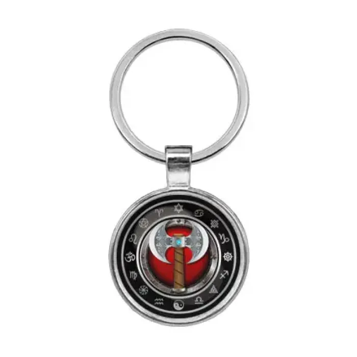 Брелок в виде секиры из бижутерного сплава со стеклянной линзой.