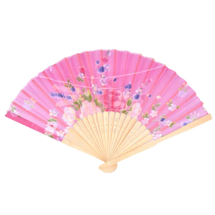 Складной веер из дерева с тканевым полотном розового цвета с цветочным орнаментом.
