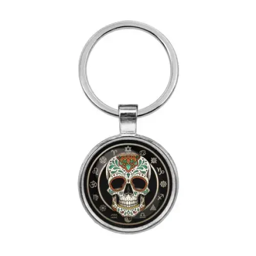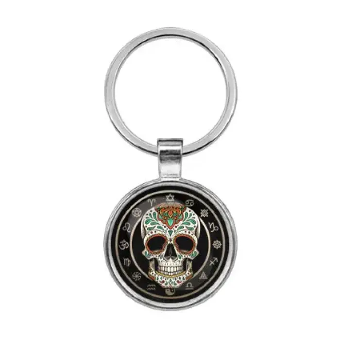 Брелок из бижутерного сплава и стали с покрытием под серебро. Изображение защищено выпуклой стеклянной линзой.