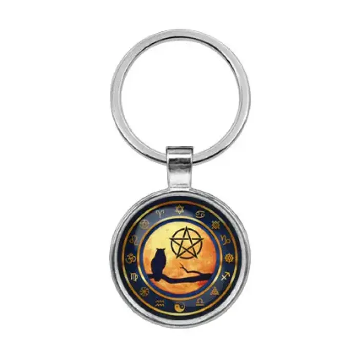 Брелок из бижутерного сплава с изображением совы и пентаграммы под выпуклой стеклянной линзой.