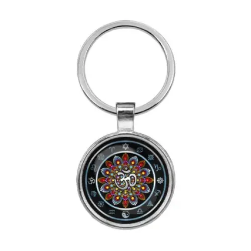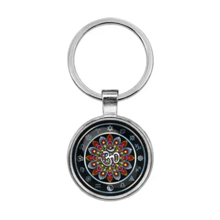 Брелок с символом Ом и мандалой из бижутерного сплава со стеклянной линзой.