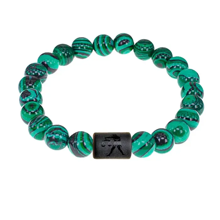 Стрейч-браслет с бусиной из синтетического шунгита в виде знака зодиака Весы и бусинами из синтетического малахита.