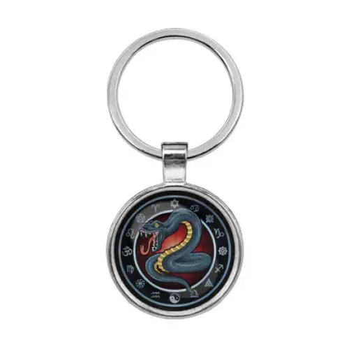 Брелок для ключей из бижутерного сплава и стали со стеклянной линзой.
