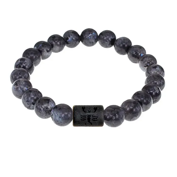 Материал и изготовление: Основной материал — синтетический шунгит. Центральная бусина с символом знака зодиака Скорпион и бусины из натурального камня лабрадор диаметром 8 мм.