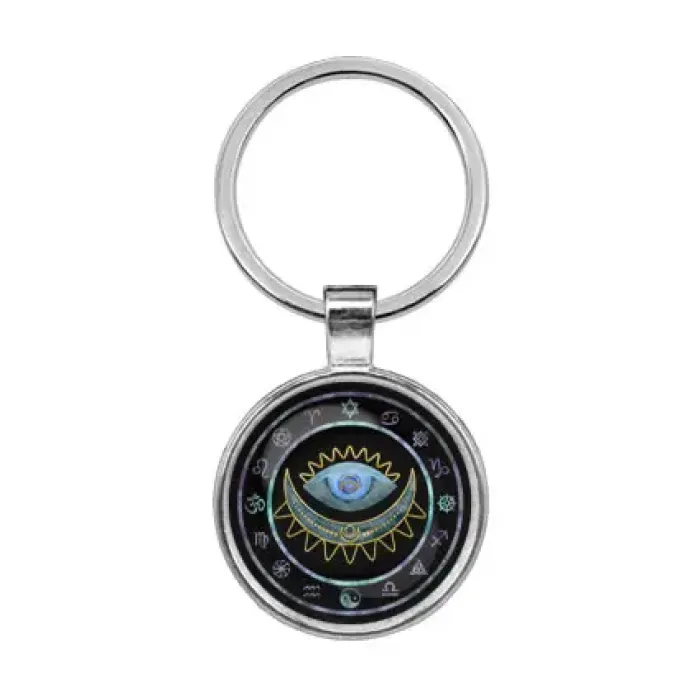 Брелок из бижутерного сплава и стекла с изображением, защищённым выпуклой линзой.