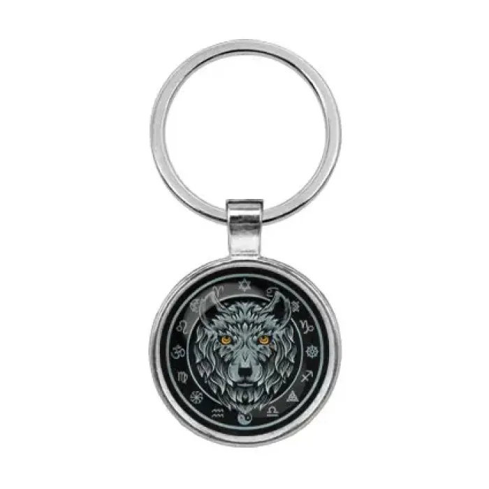 Брелок из бижутерного сплава и стали с изображением волка под стеклянной линзой.