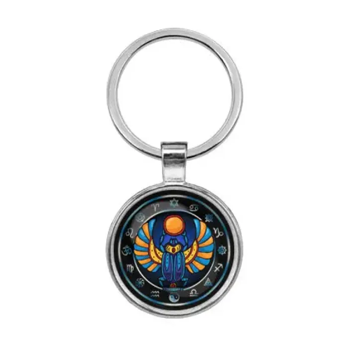Брелок в виде крылатого скарабея из бижутерного сплава со стеклянной линзой.