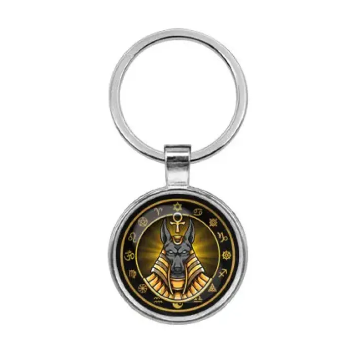 Брелок-сувенир из бижутерного сплава и стекла с дизайном в виде древнеегипетского божества Анубиса.