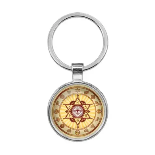 Брелок в виде символа еврейской культуры. Изготовлен из бижутерного сплава и стали с покрытием под серебро, изображение защищено выпуклой стеклянной линзой.
