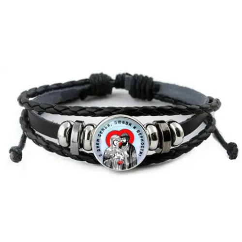 Кожаный браслет с изображением, символизирующим День семьи, любви и верности. Этот аксессуар станет прекрасным подарком для близких, подчеркивающим важность семейных ценностей. Основные особенности: