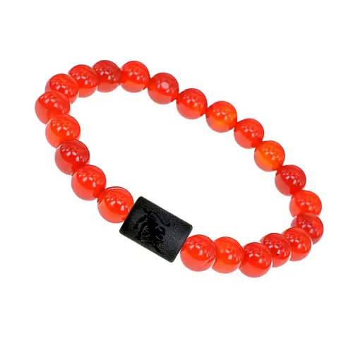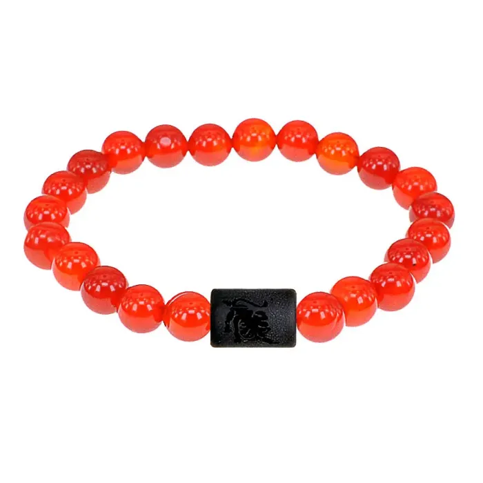 Стрейч-браслет с зодиакальной бусиной в виде Льва из синтетического шунгита и бусинами из натурального сердолика.
