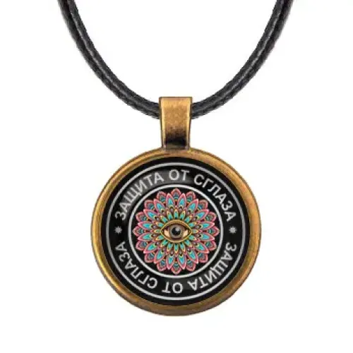 Кулон со шнурком «Защита от сглаза» — сувенирный аксессуар из бижутерного сплава с покрытием под бронзу и выпуклой стеклянной линзой.