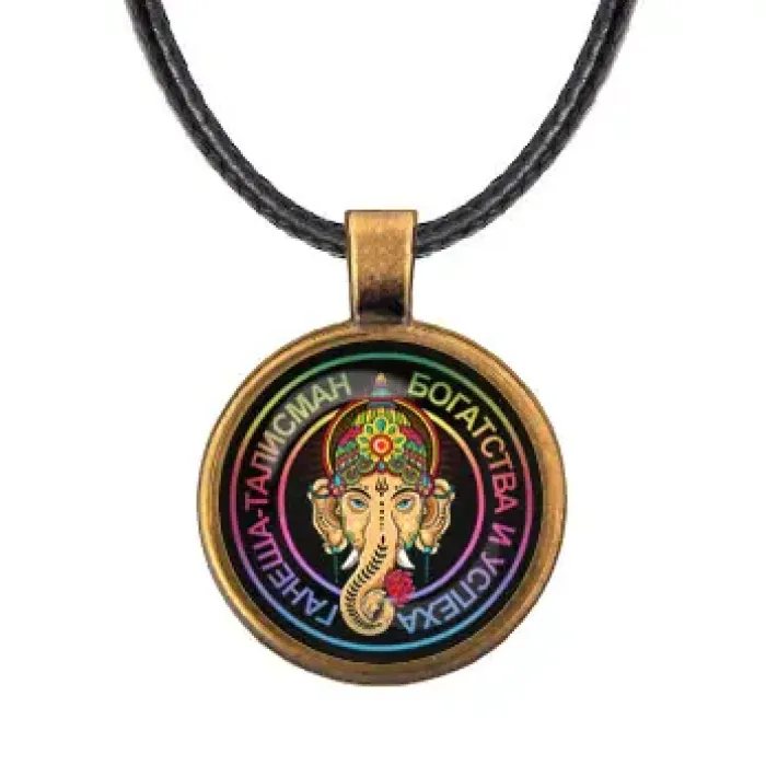 Кулон со шнурком. Изготовлен из бижутерного сплава с покрытием под бронзу и стекла, с изображением Ганеши.