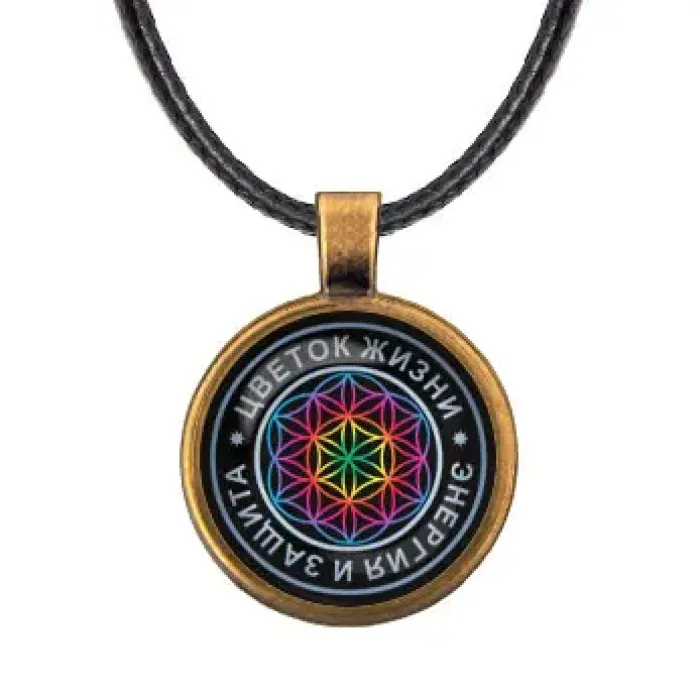 Кулон со шнурком «Цветок жизни». Изготовлен из бижутерного сплава с покрытием под бронзу, содержит стеклянный элемент под выпуклой линзой.