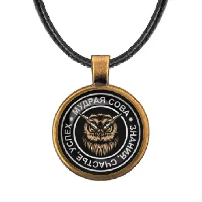 Кулон со шнурком из бижутерного сплава с изображением совы под выпуклой стеклянной линзой.