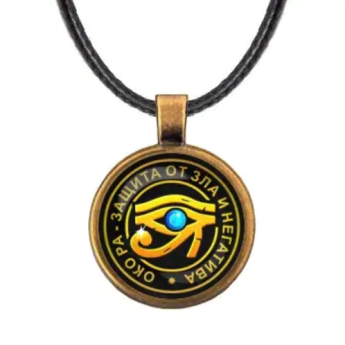 Кулон со шнурком в виде символа Око Ра. Изготовлен из бижутерного сплава, изображение защищено выпуклой стеклянной линзой.