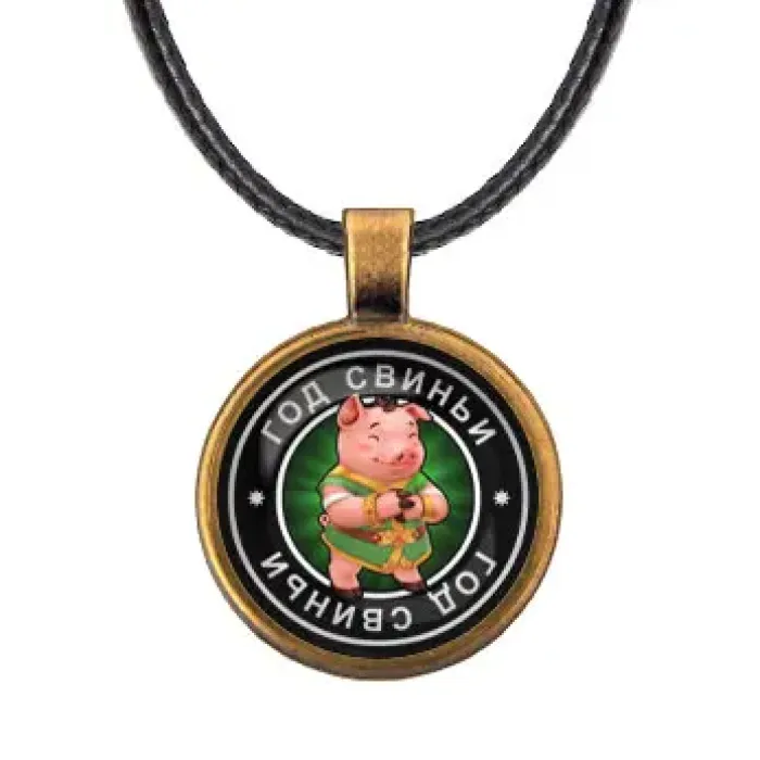 Кулон со шнурком Восточный гороскоп - год Свиньи является стильным аксессуаром, который символизирует удачу и благополучие. Этот уникальный кулон выполнен из бижутерного сплава с покрытием под бронзу и украшен стеклянной вставкой, защищенной выпуклой линзой. Диаметр изделия составляет 28 мм, что делает его идеальным для повседневного ношения или особых случаев.