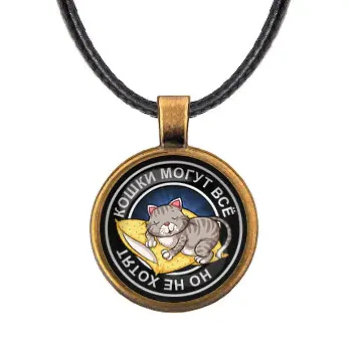 Кулон со шнурком «Кошки могут всё» — сувенирный аксессуар из бижутерного сплава с покрытием под бронзу и стеклянной линзой.