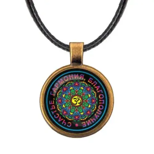Кулон со шнурком с изображением мандалы Ом. Изготовлен из бижутерного сплава, изображение защищено выпуклой стеклянной линзой.