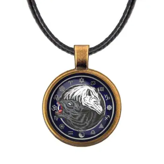 Кулон со шнурком с изображением волков в стиле Инь-Ян. Изготовлен из бижутерного сплава и стекла.