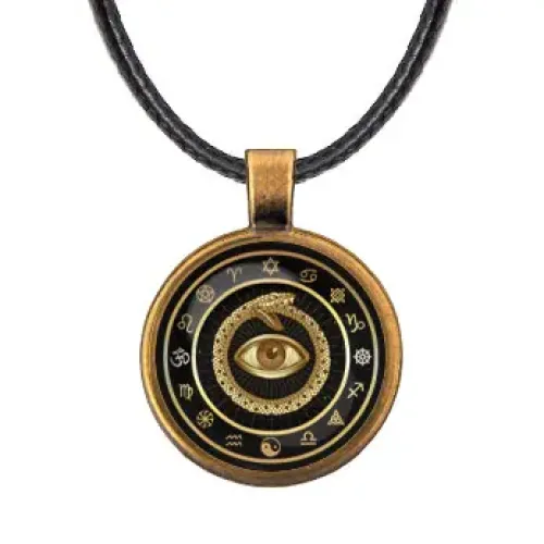 Кулон со шнурком из бижутерного сплава с изображением глаза и уробороса под выпуклым стеклом.